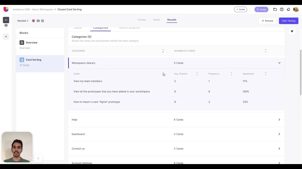 With this view, you can explore the categories that participants created, how they named them, and which cards they sorted into each category.