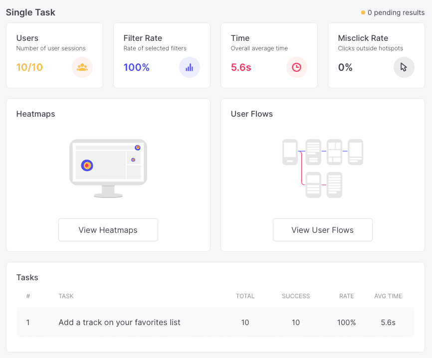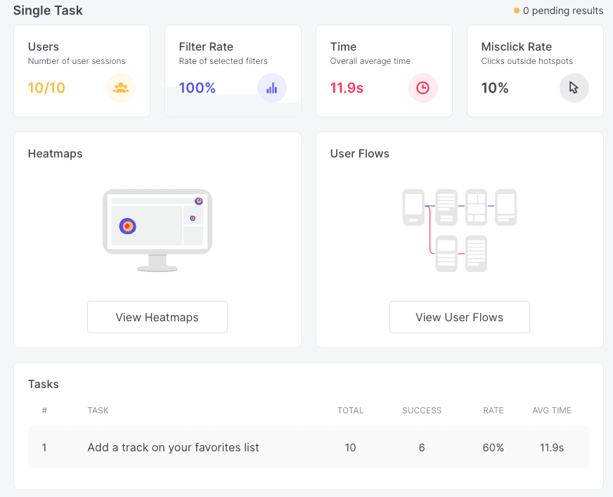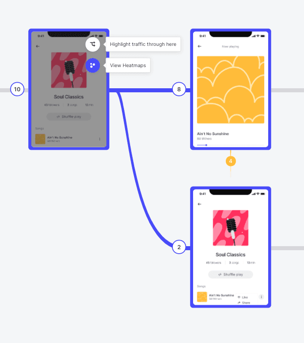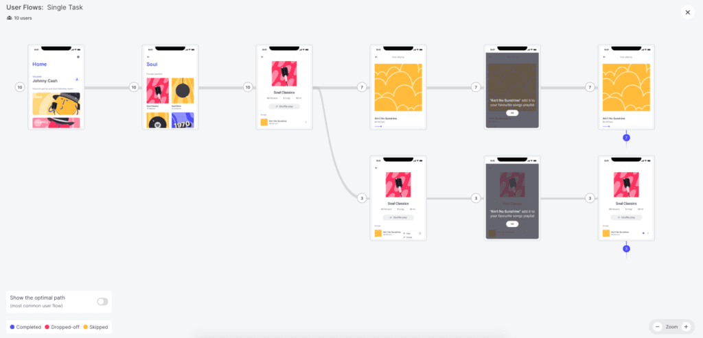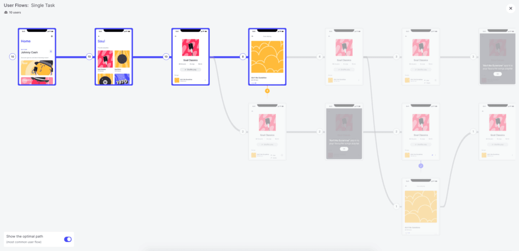 This means that you’ll be able to see if there are any specific screens that made users leave your test/prototype. Once these screens have been recognized and then altered with more appropriate or engaging content, you can go back to the User Flow report to check if the number of drop-offs has declined.