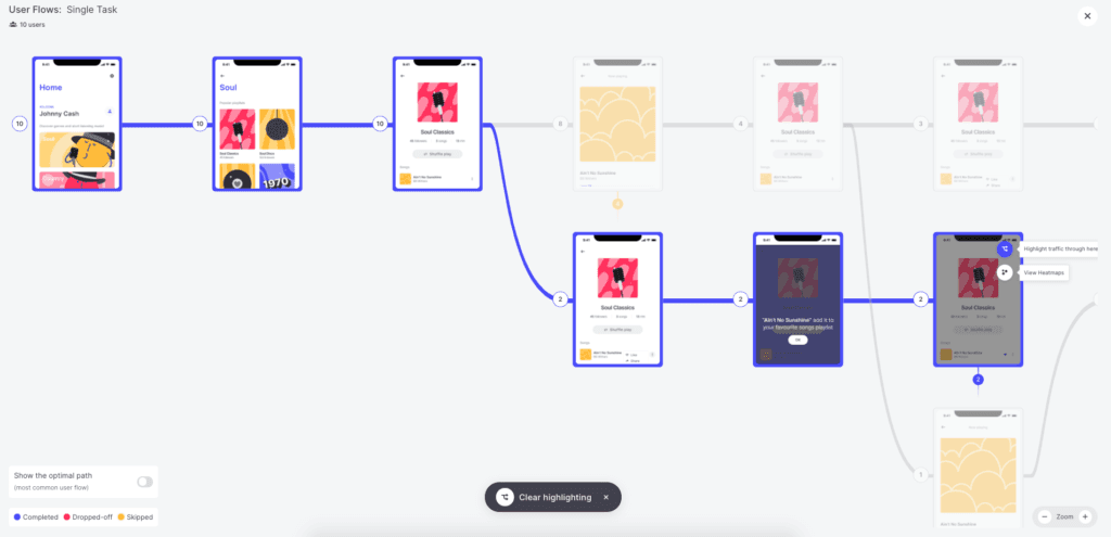 If you want to see the path that users took in order to land on a specific screen on the user-flow, just click the “highlight traffic through here” button!