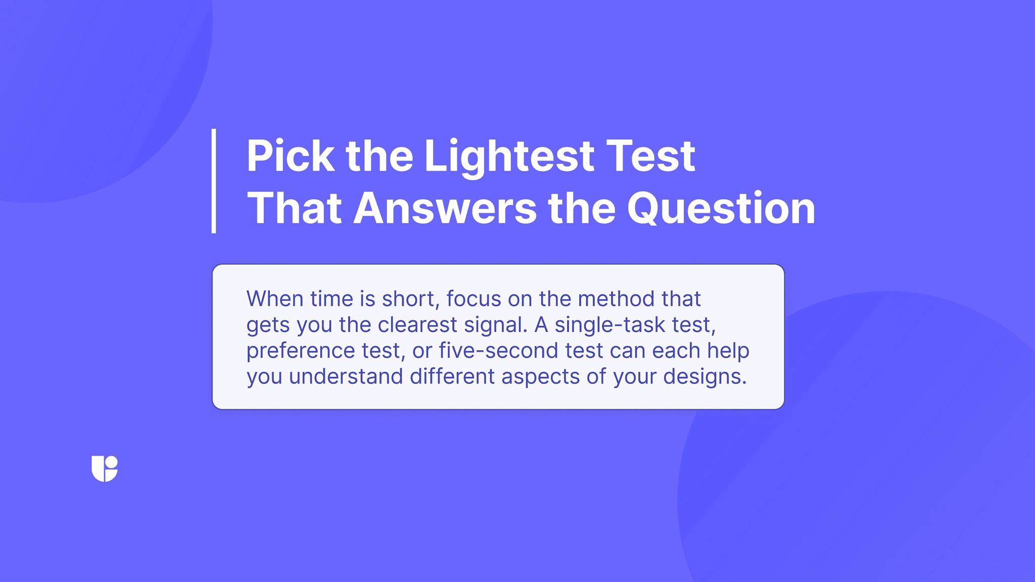 Quick tests fit best before “big decisions” when the direction is still flexible but time is tight. Before a design sprint, run a quick study to validate assumptions or check visual hierarchy. Midway through, use a preference test to confirm that your new design direction feels right. Just before launch, run a short usability test to uncover any last friction points that might affect your user journey. These checkpoints don’t replace full research cycles, but they add speed and confidence to your process. You learn just enough to take your next step with more confidence.