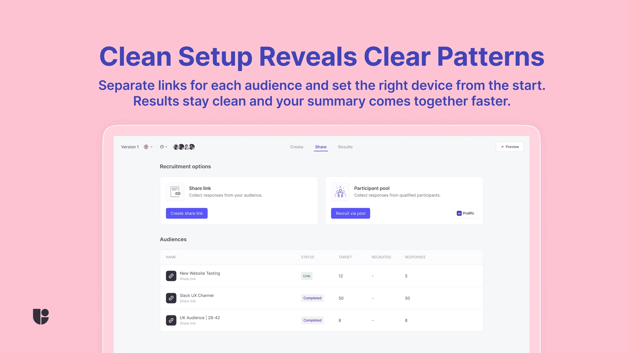 Self recruitment is perfect when you already have an audience you can reach. Customers, beta testers, communities, or colleagues can deliver quick feedback with real context. You control timing and budget, and you can segment easily. The key is adding a few guardrails so speed does not turn into sprawl. Separate different audiences with their own link, name links clearly, and share them where those people already are. A little structure up front saves a lot of cleanup later.
