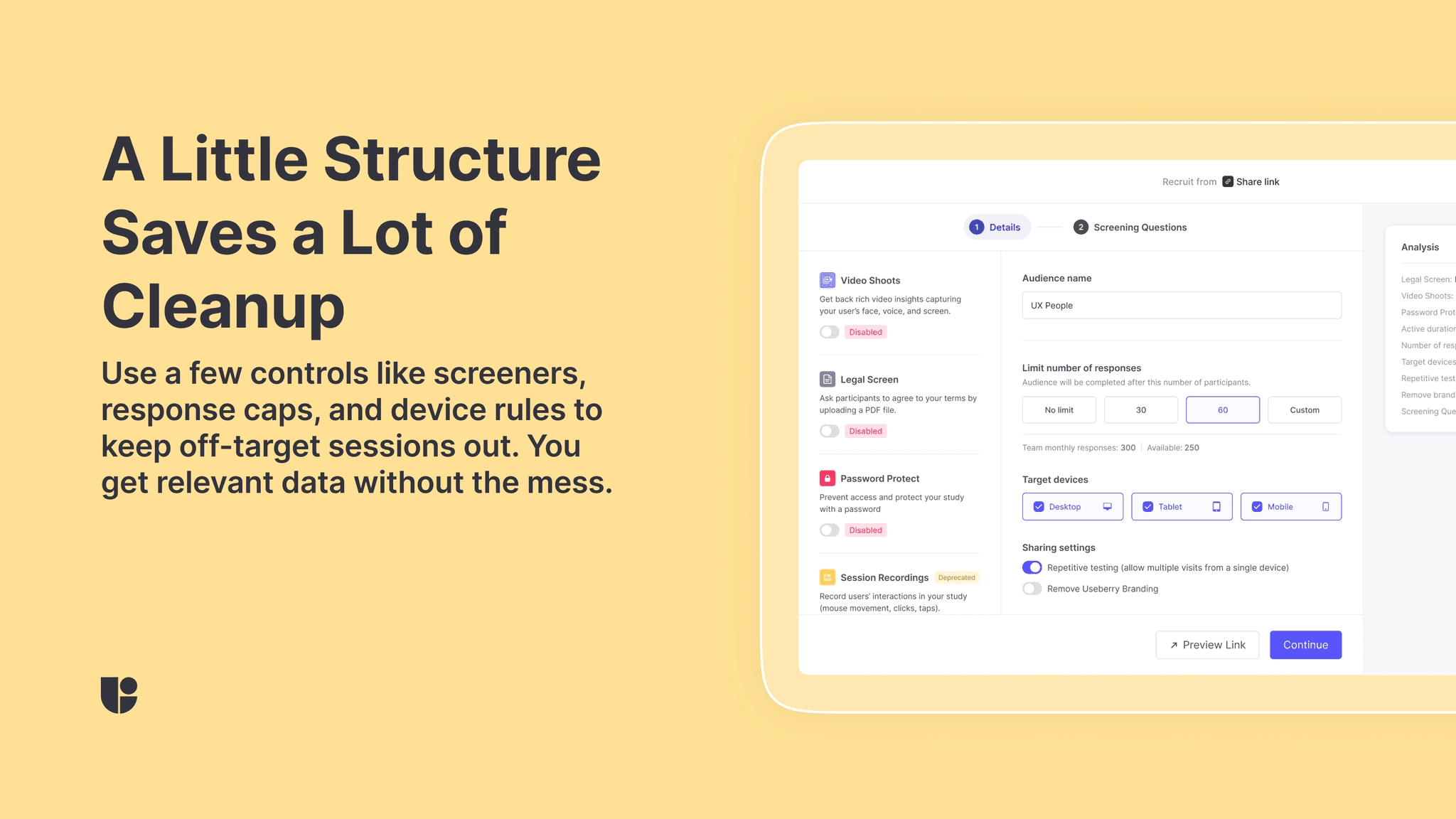 Screening questions: Qualify people before they start. Short, targeted screeners makes sure only relevant users participate in your sessions and reduce cleanup later.