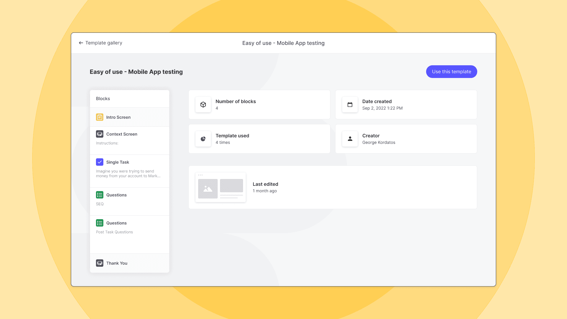 To give you a taste of what these templates look like in action, let’s look at an example: our “Usability testing a product feature” template. This template helps you assess the usability of a specific feature within your product. In using this template, you would ask participants to complete a task using the feature in question. The template then guides you in gathering data about whether the participants found the task easy or difficult to complete, what they expected to happen after completing the task, and how they perceived the overall usability of the feature.