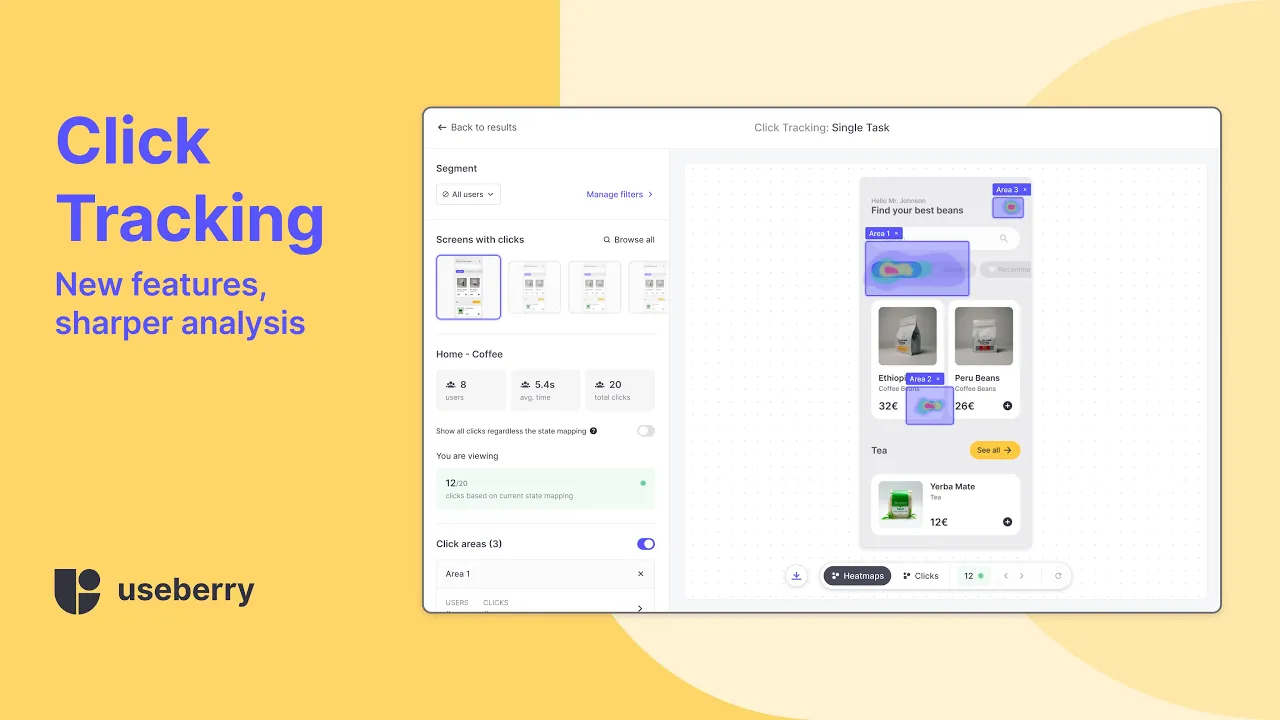 Useberry’s new Click Tracking feature empowers deeper, tailored analysis. It enhances the capability to scrutinize user behavior, offers insightful metrics for UI refinement, and facilitates focus on specific screen areas.