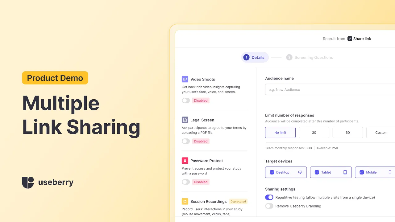 Multiple Share Links allow you to create unique links for different audiences in the same study and track responses. You can have multiple audiences taking your UX study concurrently without worrying about mixing responses. This is especially useful when running A/B tests, where each group needs a specific recruitment method, or when you need to target distinct audiences in different demographics or experience brackets.