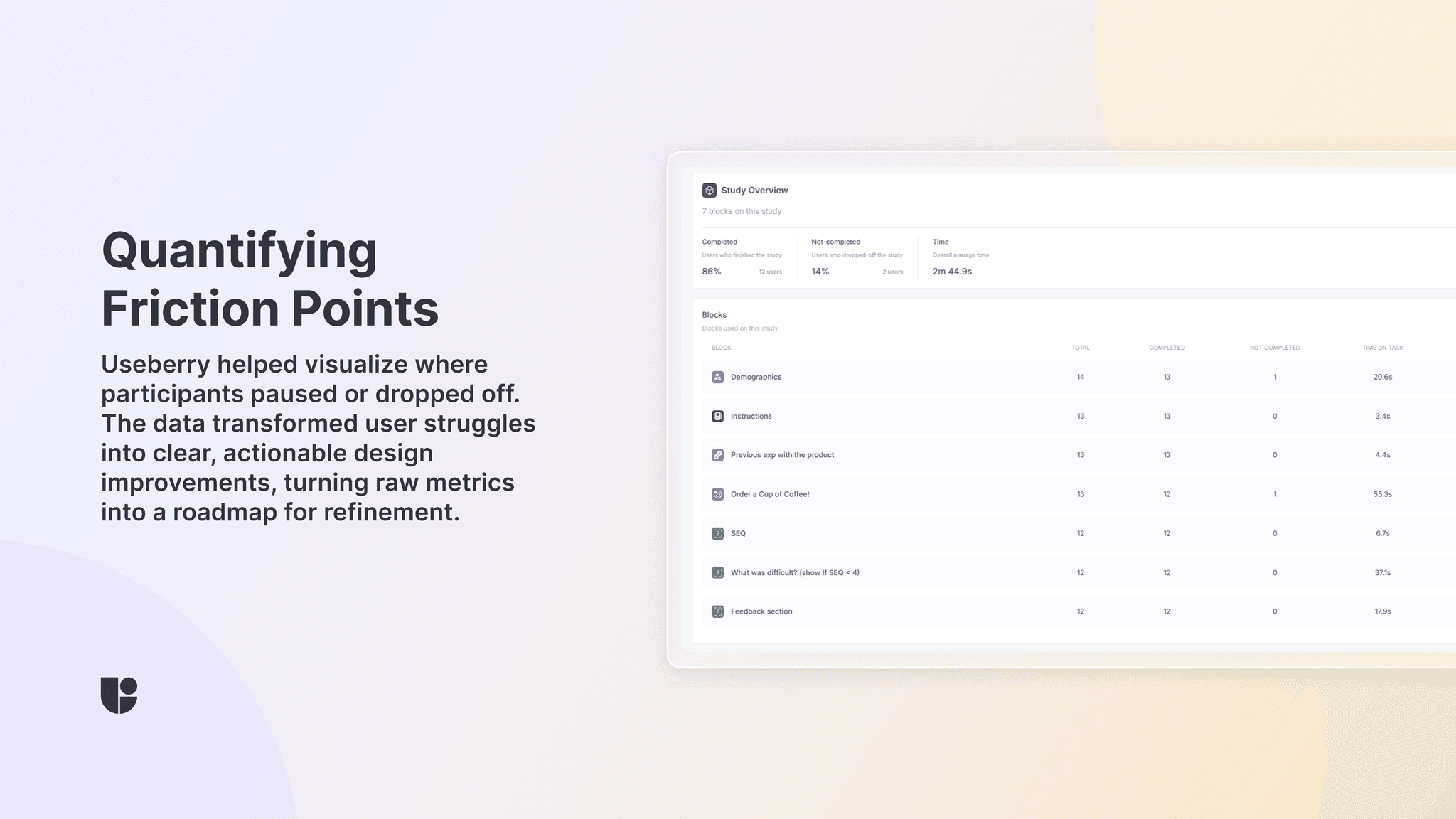 In my case, 86% of participants completed the main task successfully. The remaining users dropped off at predictable friction points one at the demographics screen and another at the coffee order tasks. These results provided actionable insights for improving clarity, simplifying steps, and refining micro interactions.