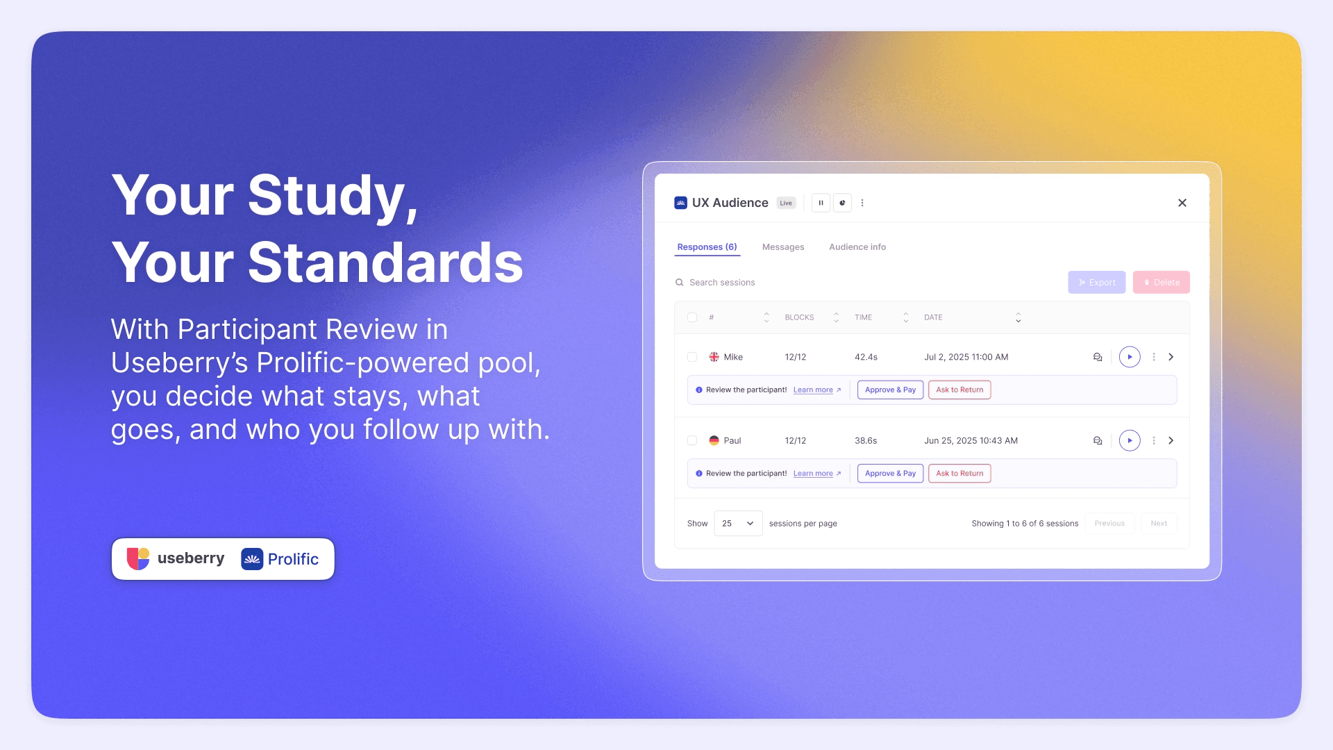 Available when using our Participant Pool powered by Prolific, this feature combines the flexibility of reviewing and managing responses with access to a vetted panel of over 200,000 participants across 38+ countries. You get fast turnaround times (often under 2 hours), over 300 audience filters, and built-in quality checks before your own review process even begins.