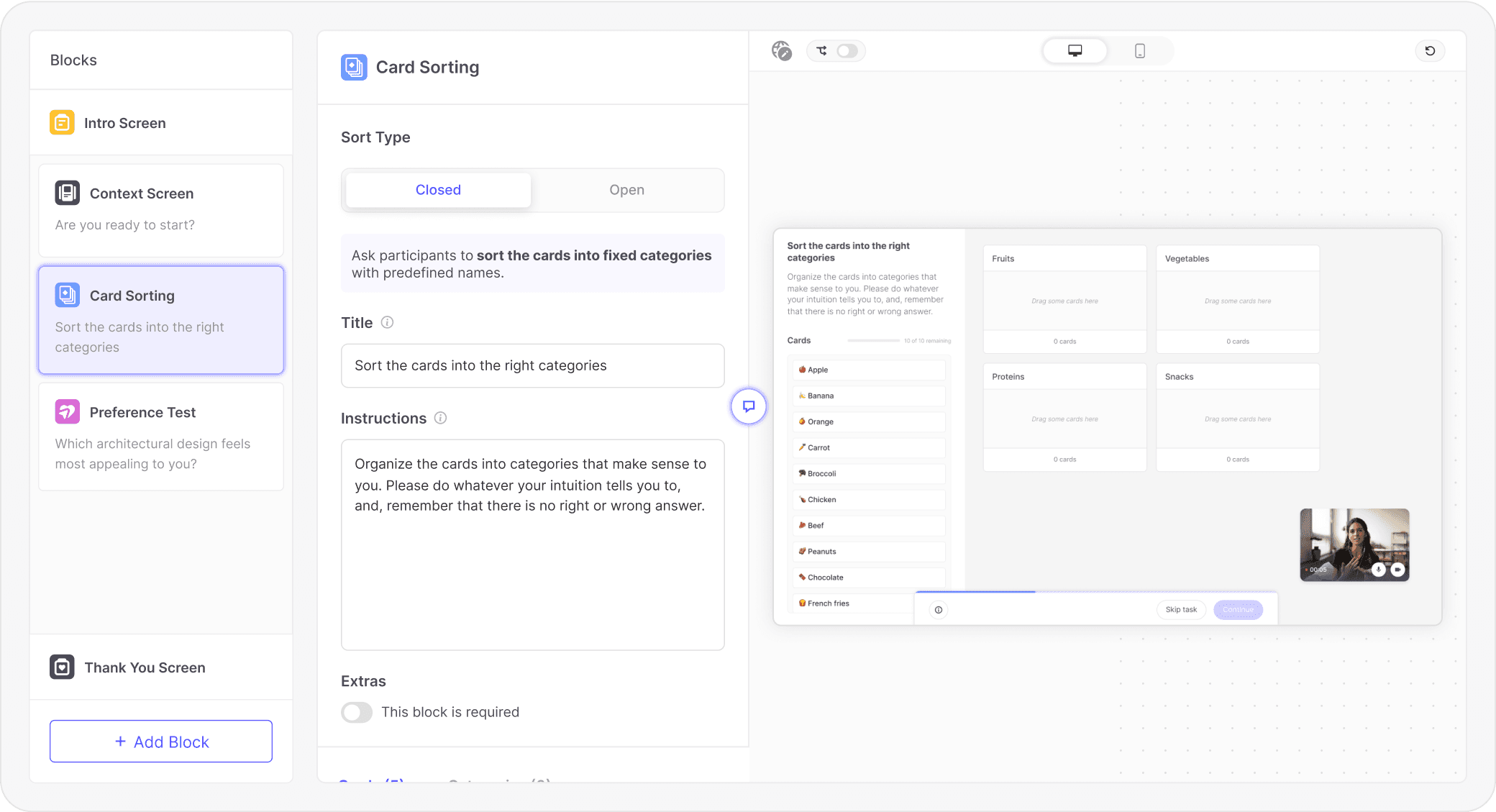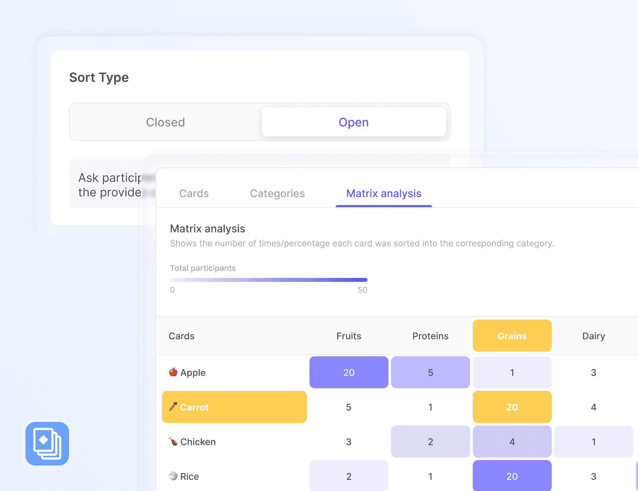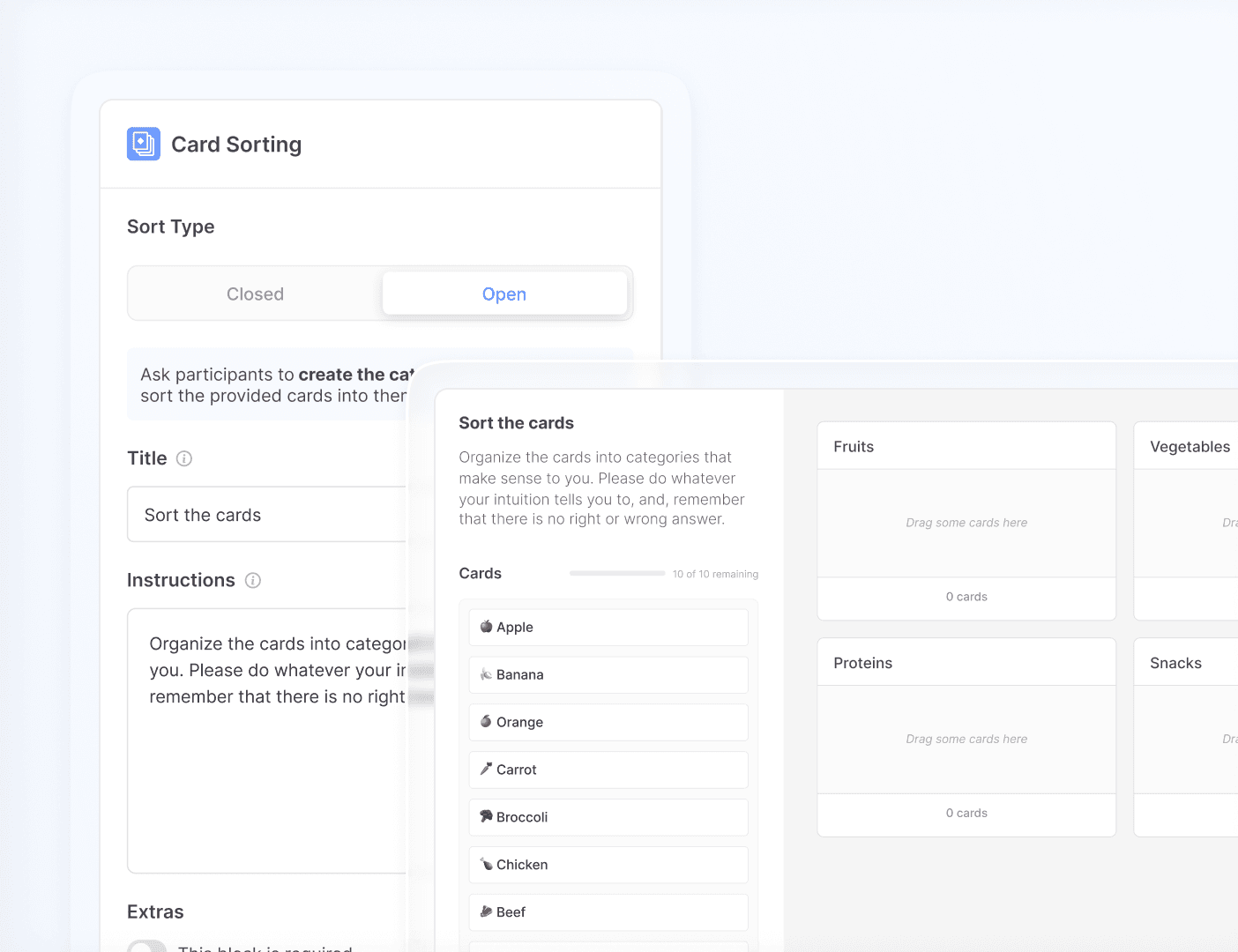 You can set up Open or Closed Card Sorting, customize instructions, and define the cards you want to test. Observe how people think about your content before you commit to a structure.