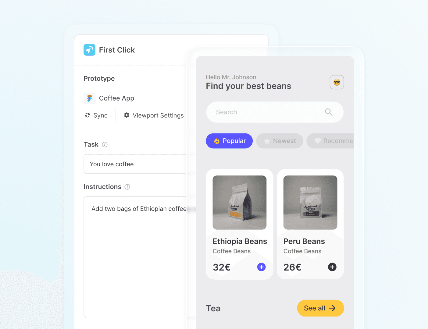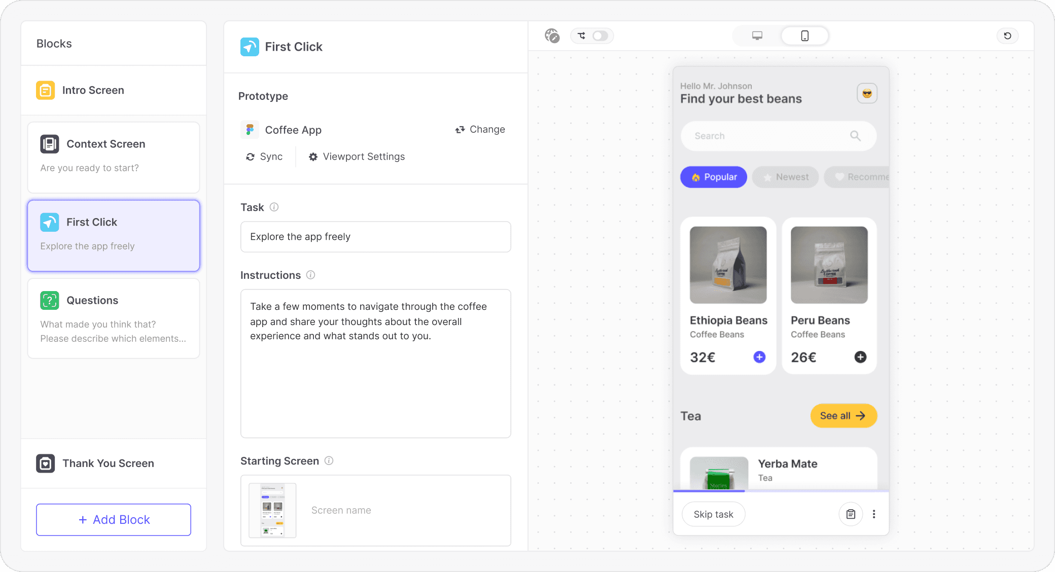 Ask participants to accomplish a task and capture their first instinctive click. The test ends after the first click, helping you understand the path users would take, user expectations, and interface clarity.