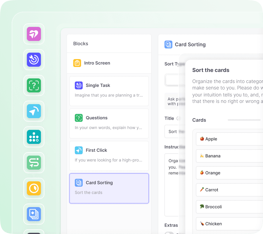 Combine flexible research methods to explore navigation, validate decisions, compare designs, or collect feedback without slowing your workflow.