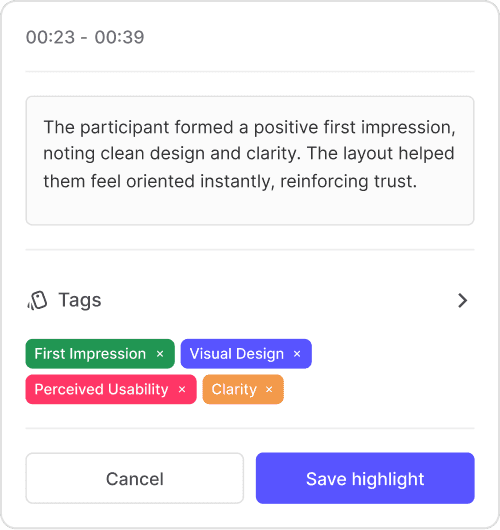 Give structure to your highlights. Add color-coded labels so you can group and spot patterns across many sessions.