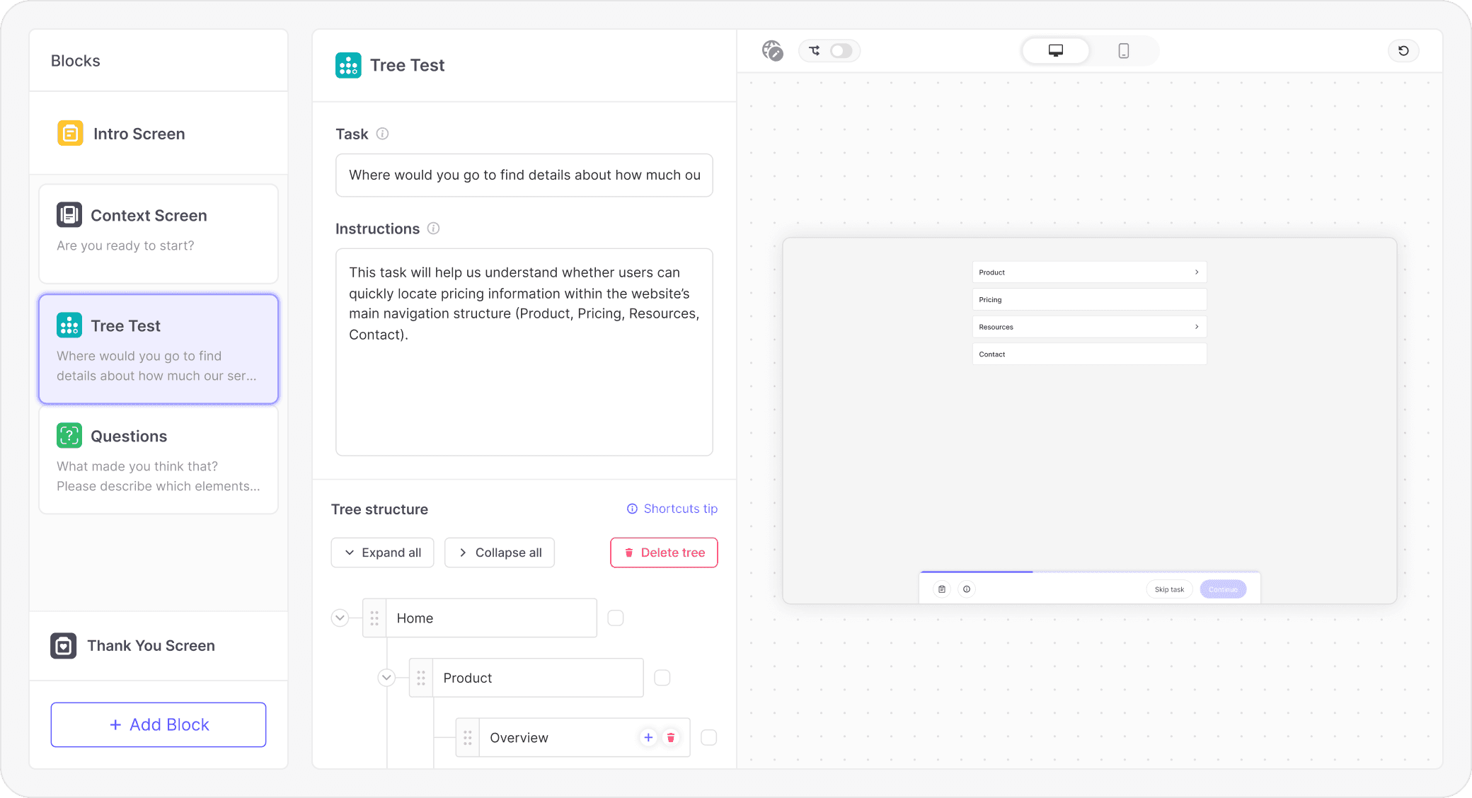You can define tasks, customize instructions, and set up tree structures that mirror your product or website. This lets you test navigation before investing in design or development.