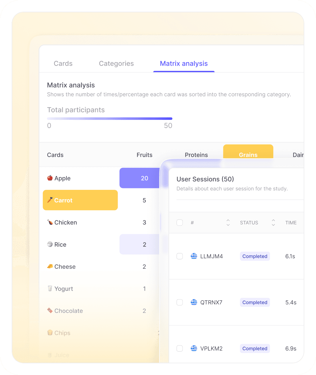 Choose from a full suite of major methods. Run usability testing, card sorting, tree testing, surveys, and more. Combine methods to answer complex research questions efficiently.